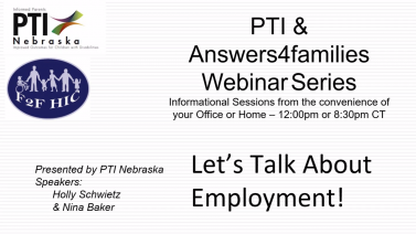 Answers4Families partners with PTI Nebraska to provide bi-monthly webinars covering a range of topics related to children and youth with disabilities, and their families.
